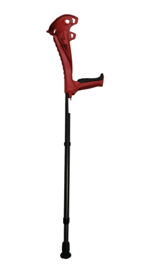 Formato que possibilita apoiar ou pendurar a canadiana na extremidade de um móvel, sem que a mesma caia e um pequeno dispositivo de bloqueio que permite manter as canadianas de pé entre si, sem necessidade de acessórios adicionais.