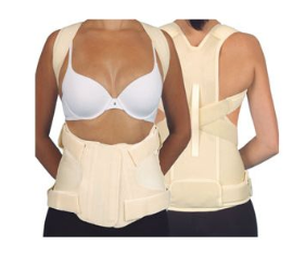 Ortótese dorsolombar fabricada com uma estrutura metálica forrada com material transpirável e elástico.