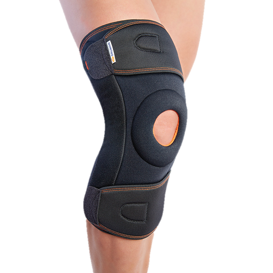 Joelheira de apoio, compressão e estabilização medio-lateral.