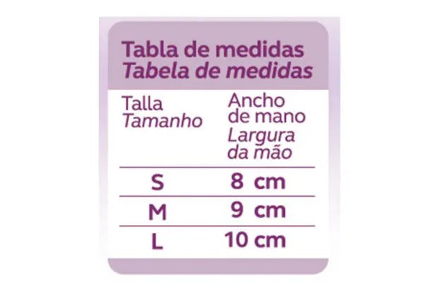 Tamanho (com uma régua ou fita, medir a largura da palma da mão, logo abaixo dos dedos):