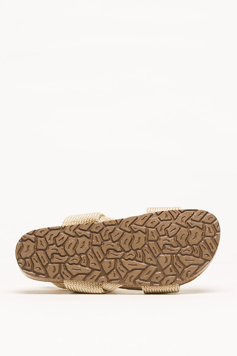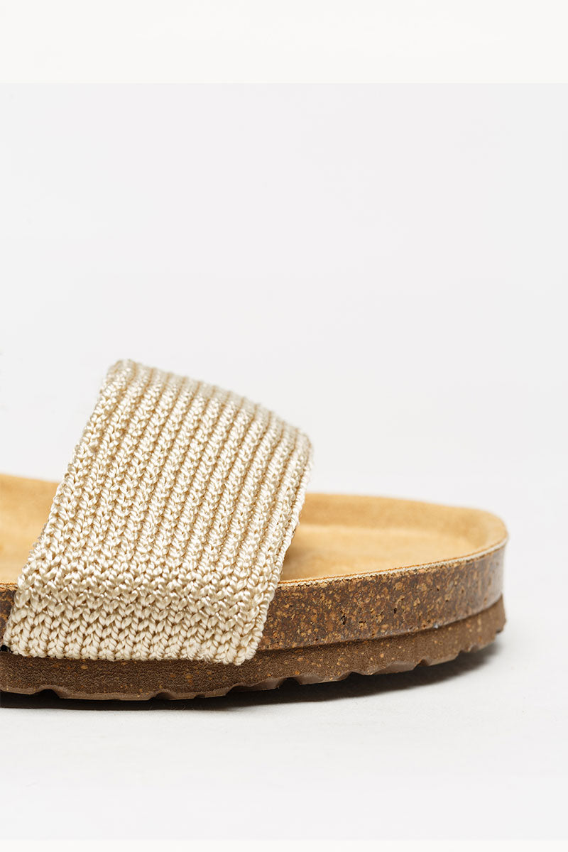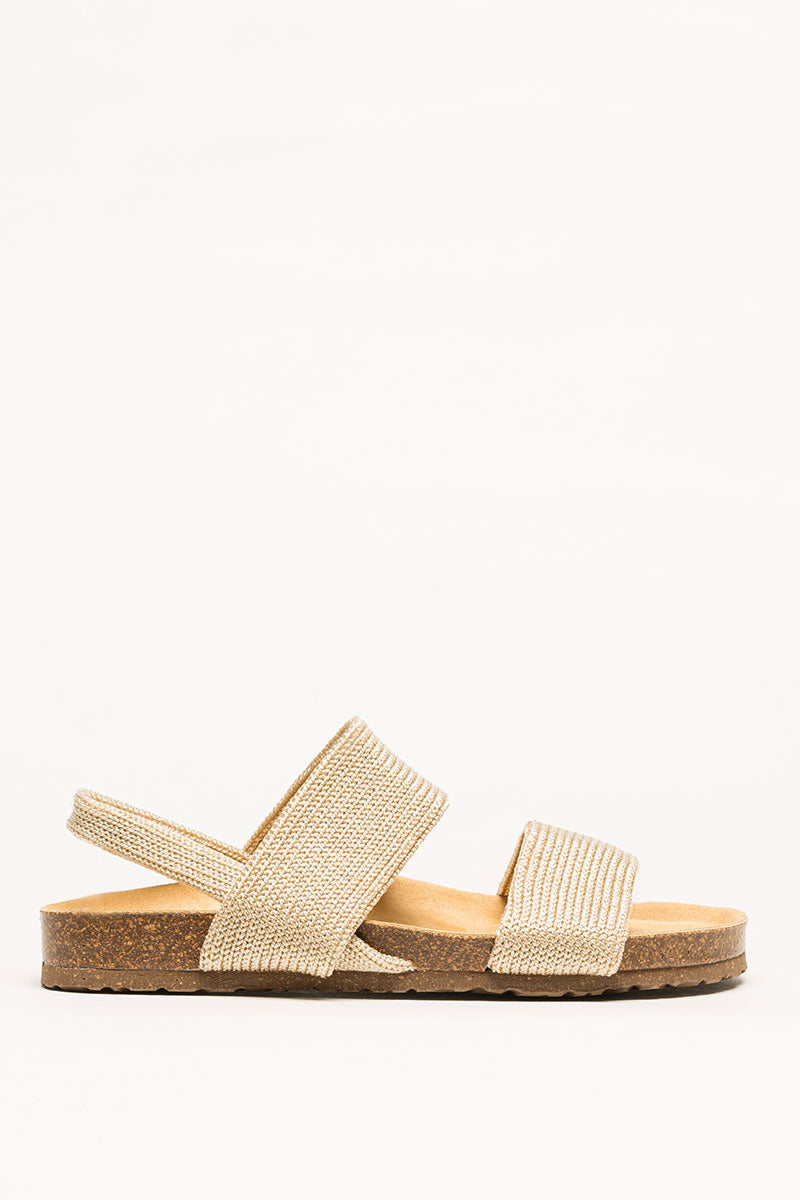 Sandália em malha ajustável ao pé, com palmilha de cortiça com látex.