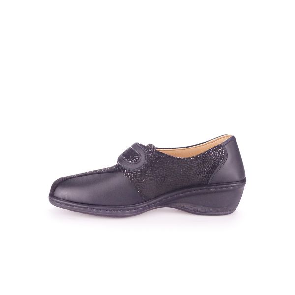 Sapato em pele genuína, com ampla abertura e ajuste graças à tira de velcro na parte frontal.