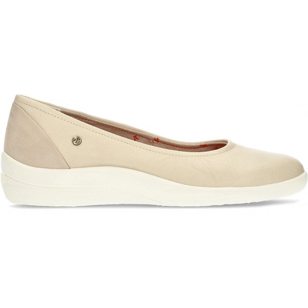 Sapato confortável, em couro bege com palmilha acolchoada e removível. (reduz o impacto nas articulações).